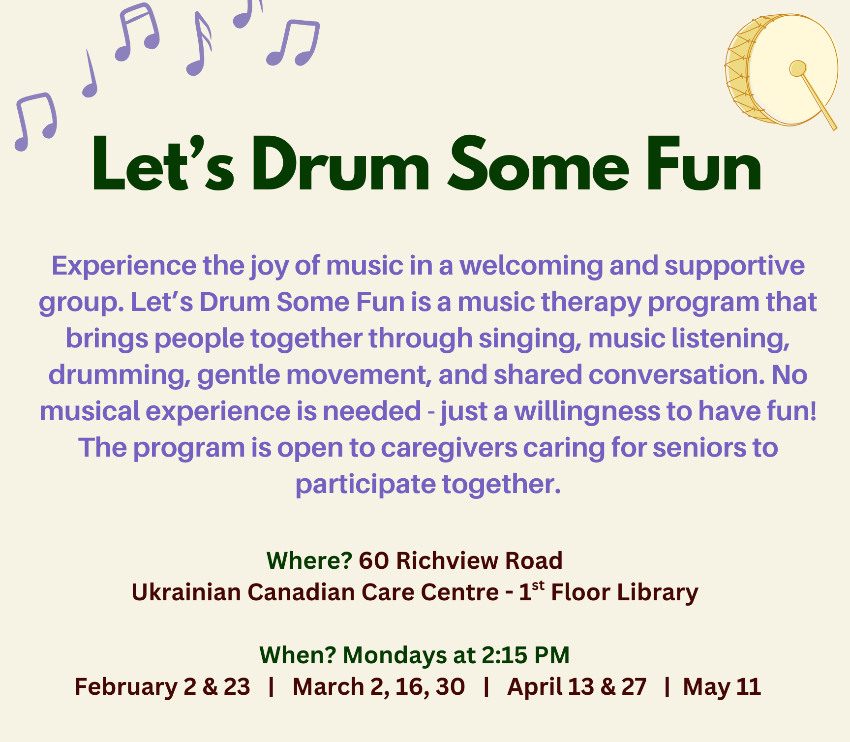 Description: Experience the joy of music in a welcoming and supportive group. Let’s Drum Some Fun is a music therapy program that brings people together through singing, music listening, drumming, gentle movement, and shared conversation. No musical experience is needed - just a willingness to have fun! The program is open to caregivers caring for seniors to participate together.