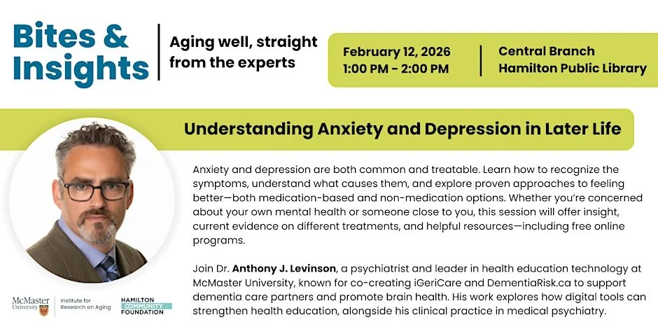 Join researchers and experts from the McMaster Institute for Research on Aging (MIRA) for Bites & Insights, a community talk series designed to share practical, evidence-based ways to stay healthy and engaged in the activities you enjoy as you age. Each session includes time for audience questions and open discussion. Light refreshments will be provided.