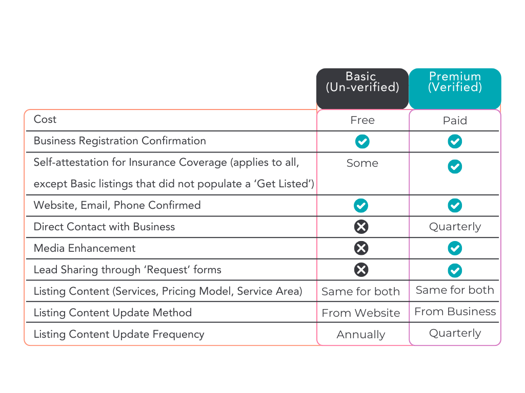 We have two types of business listings on the Carebee Rolodex: Basic (Un-verified) and Premium (Verified). Both listing types include the same core content, but differ in the level of verification, engagement, profile enhancements and leads sharing with the businesses. Premium business listings allow us to build a stronger relationship with the businesses and ensure information is more current.